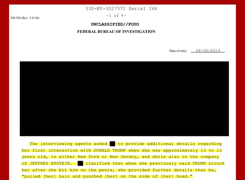 Trump and Epstein referred to such young girls as “fresh meat,” “untainted,” and “not jaded.” Donald J Trump then struck the young girl after she bit him on his penis, “pulled her hair and punched her on the side of her head.”