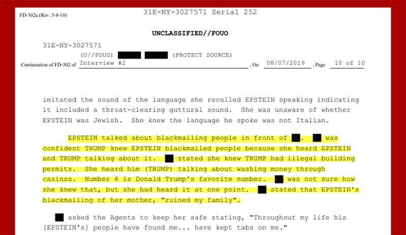 The young girl heard Trump and Epstein talking about Epstein blackmailing people. She stated she knew Trump had “illegal building permits.” She heard Trump talking about “washing money through casinos.” And she claims she knows Donald J Trump’s favorite number is six (p10).